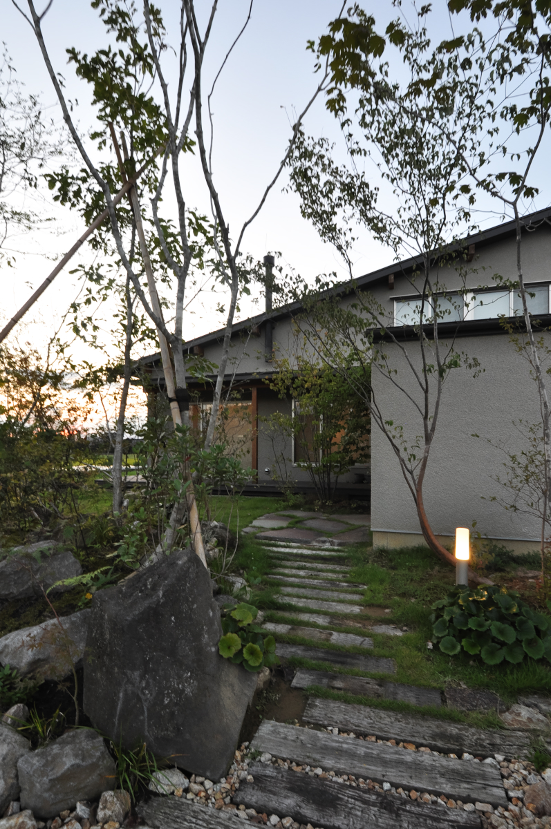 散歩コースで歩く人、朝夕の通学、何気ない日常の中で触れる景色が心地よさを与え、少しでも多く緑の溢れる美しい街並みが広がってほしいという希望を込めています。2013年に竣工後、段階的に自身で庭づくりをしてきましたが2017年春に庭を作りました。