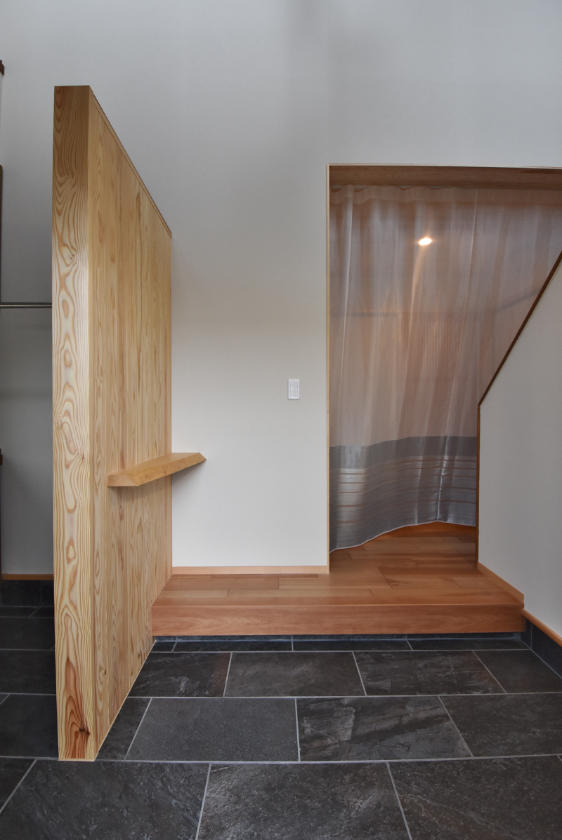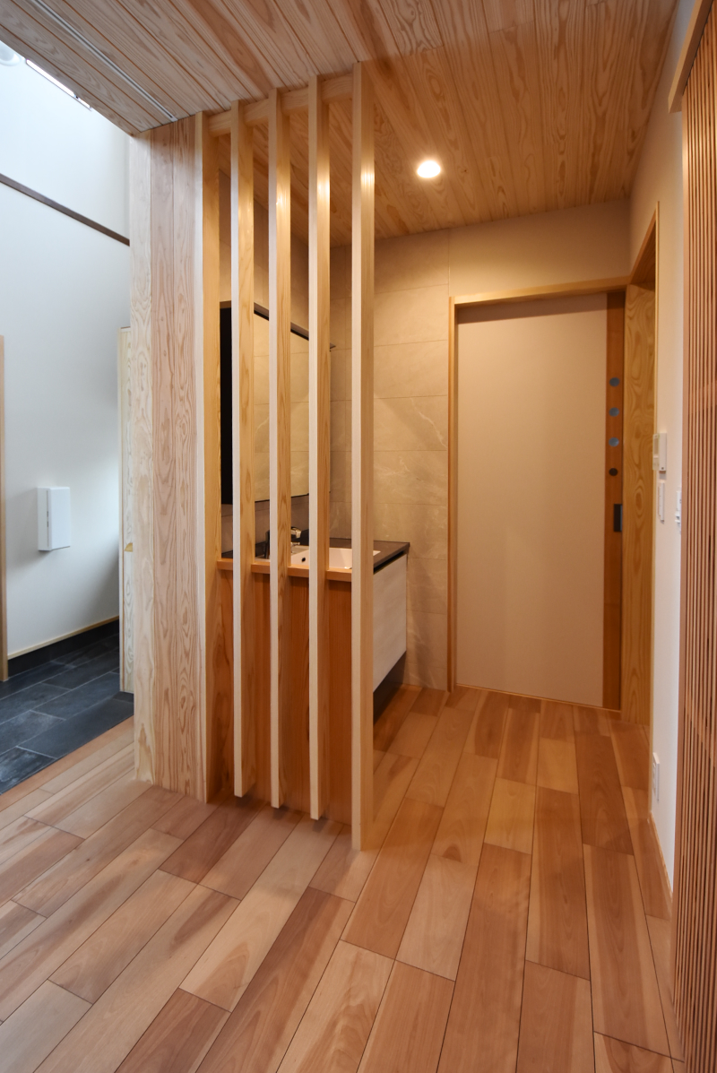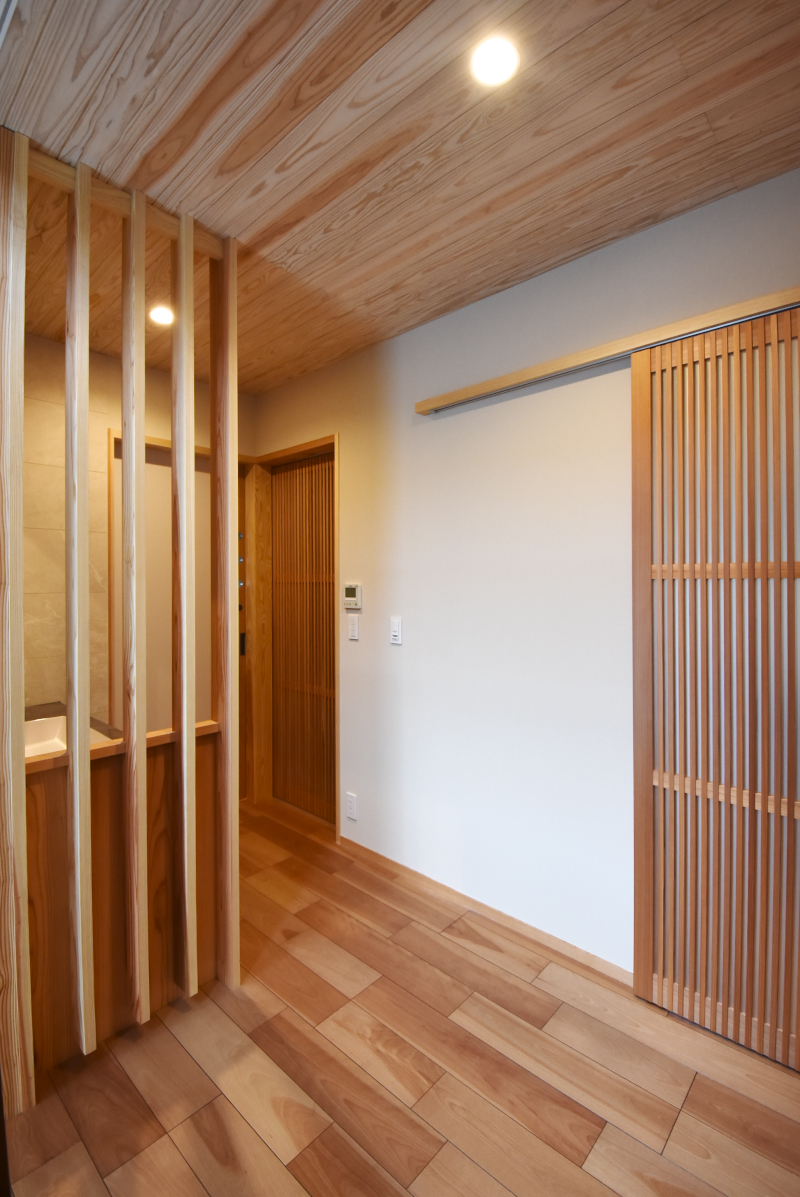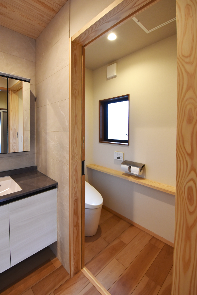 洗面・トイレ・脱衣室の配置を工夫し、アプローチの仕方を変えるだけで、大きくは間取りを変えずとも飛躍的に使いやすくなりました。間取りをさわり過ぎない=余分な解体や手間の費用を抑える事に繋がります。また昔ならではの収納の少なさも解消するよう工夫しています。