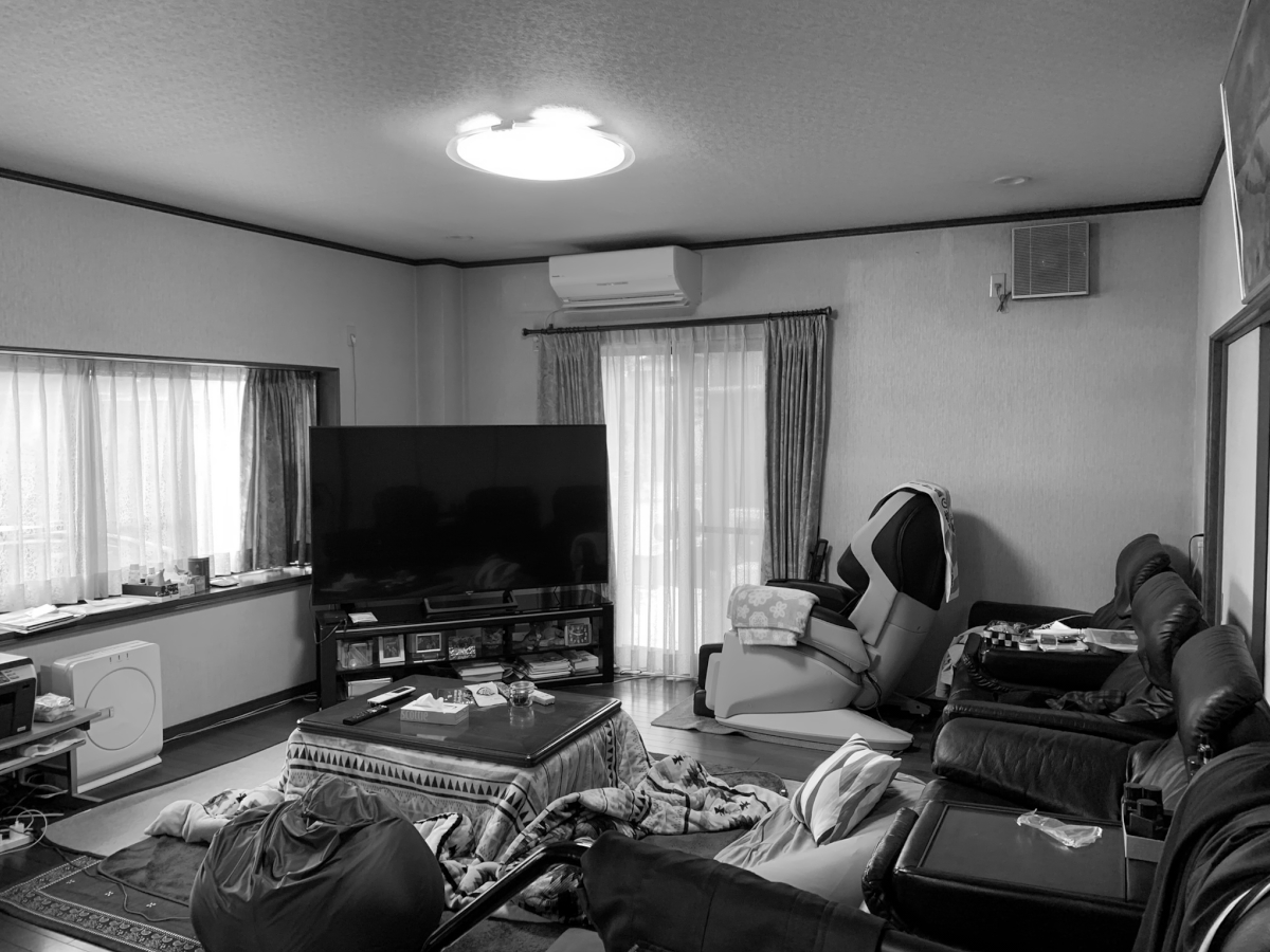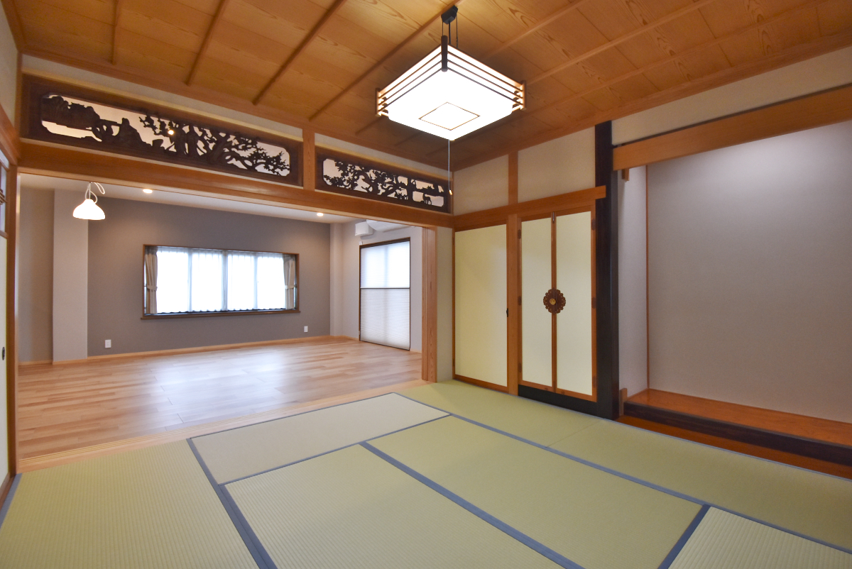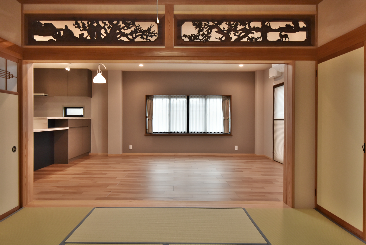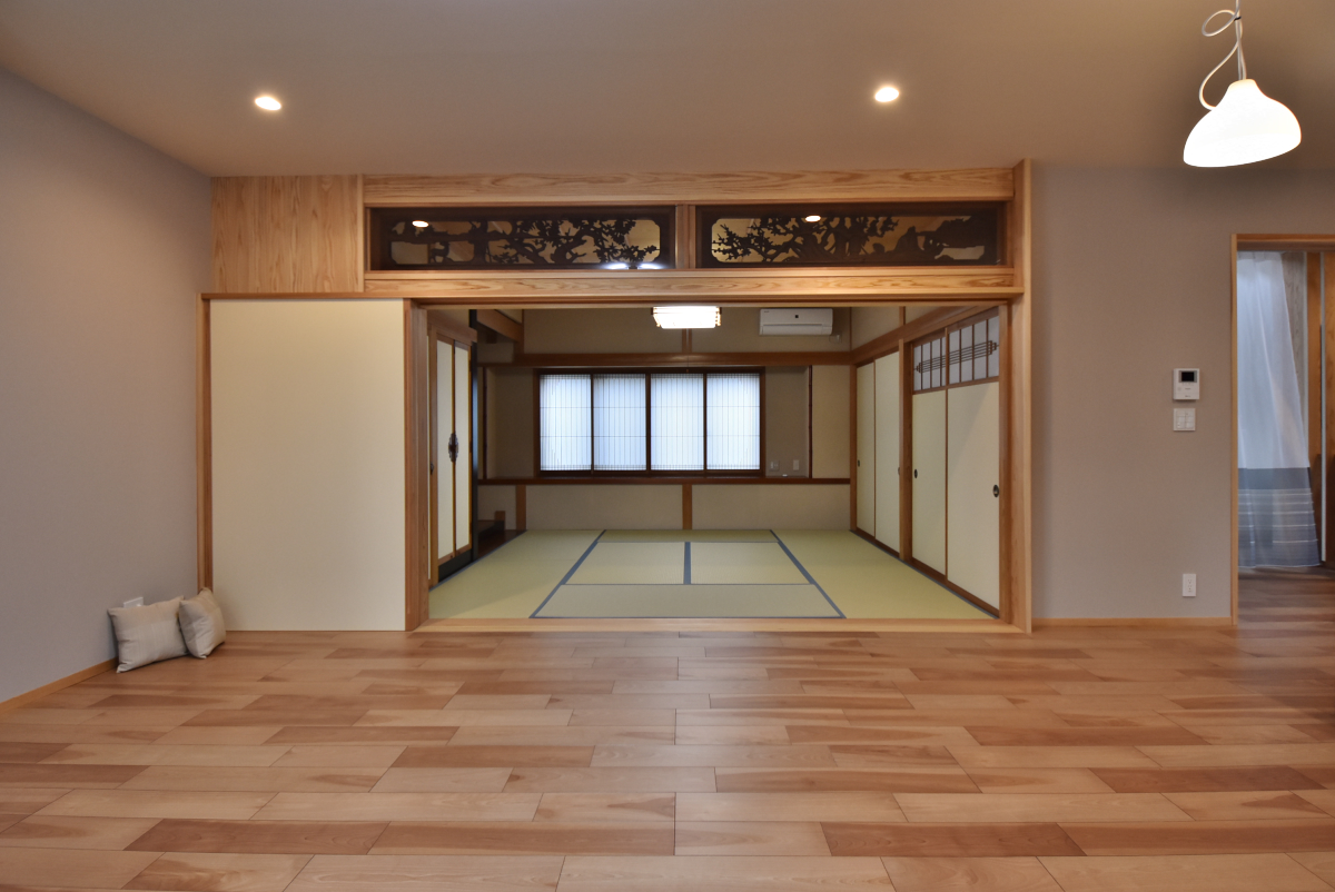 水回りをコンパクトに抑えたので、LDKの大空間はそのまま確保しつつ収納量もアップ。リビングでは1日の終わりにお父さんが大きなソファーでくつろがれています。孤立していた和室をリビングから使えるようにしたので、お孫さん8人の大家族一同に集まる日は和室を開放して、楽しいお祝いの場になっています。