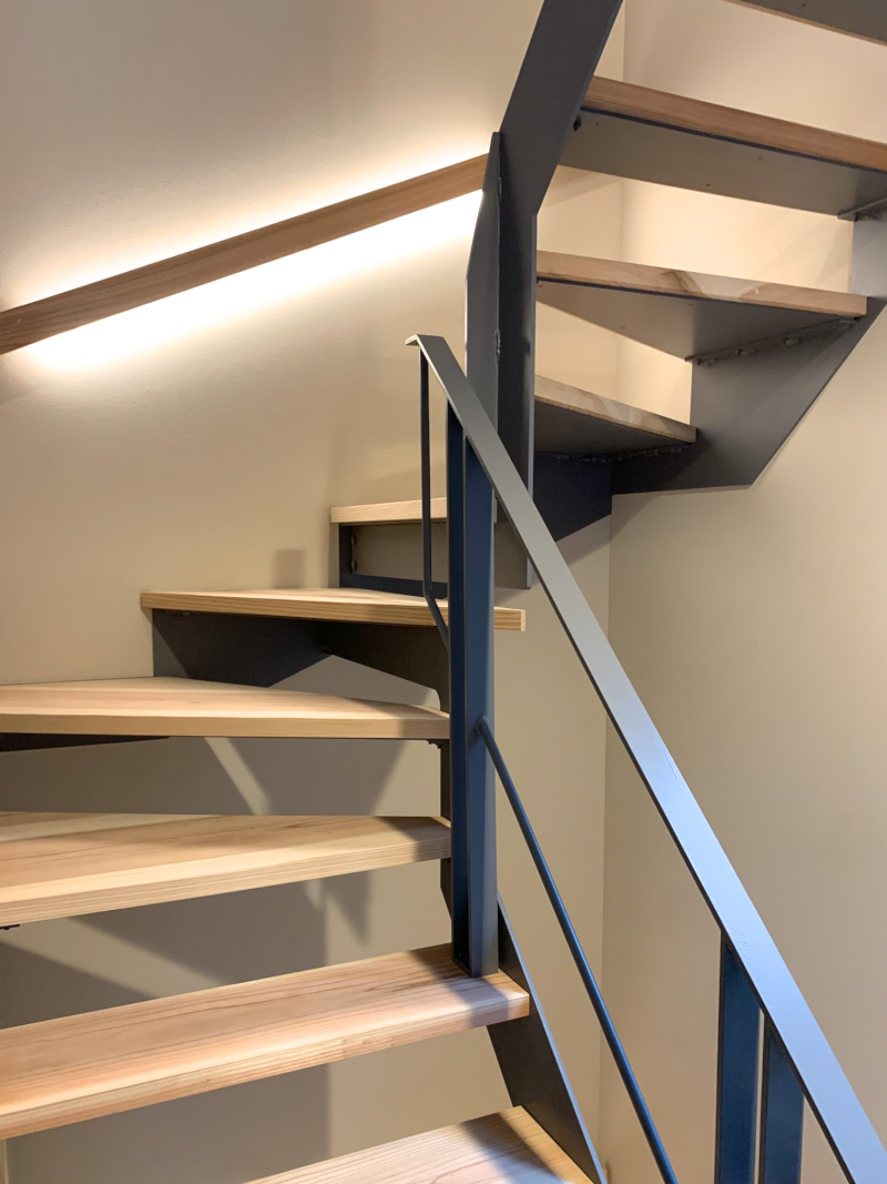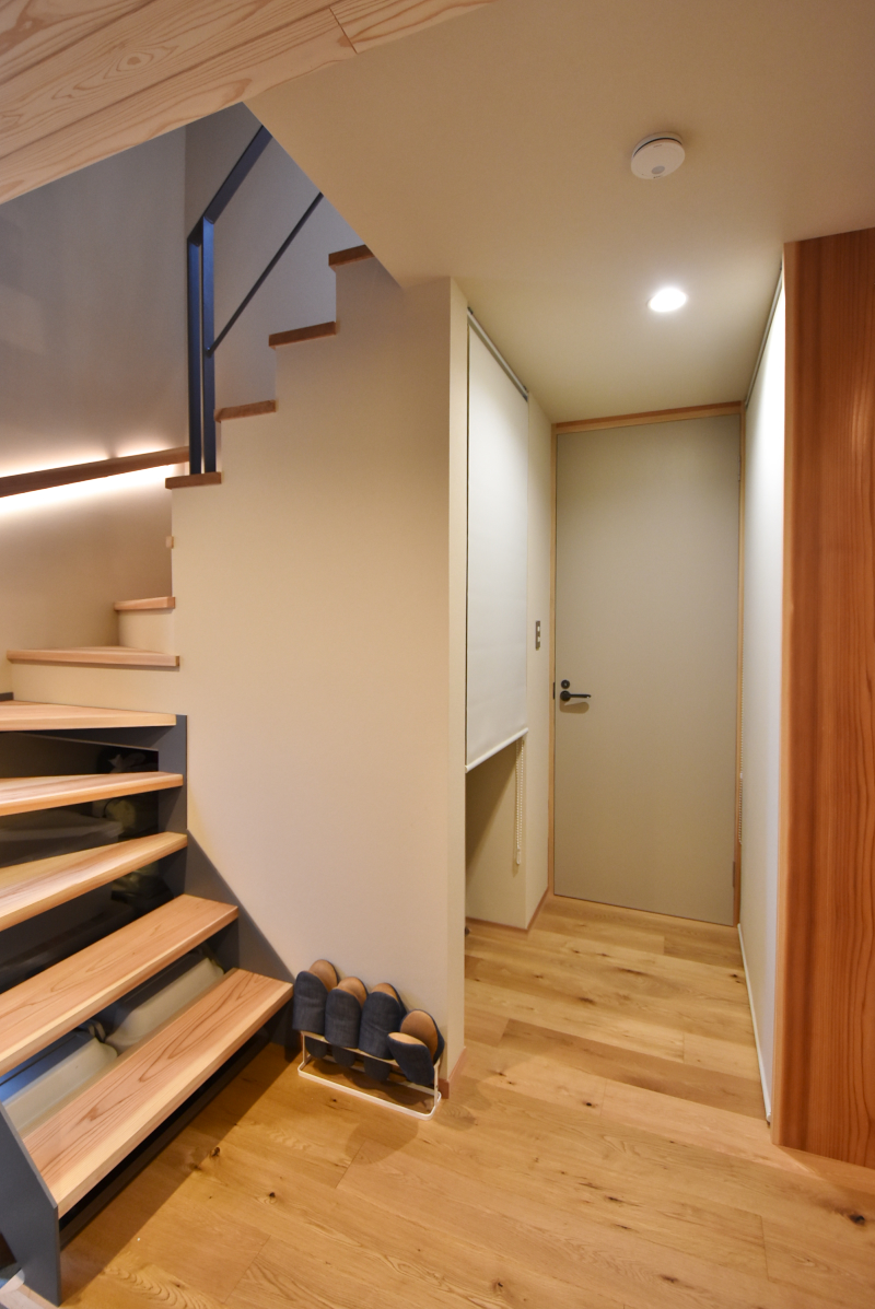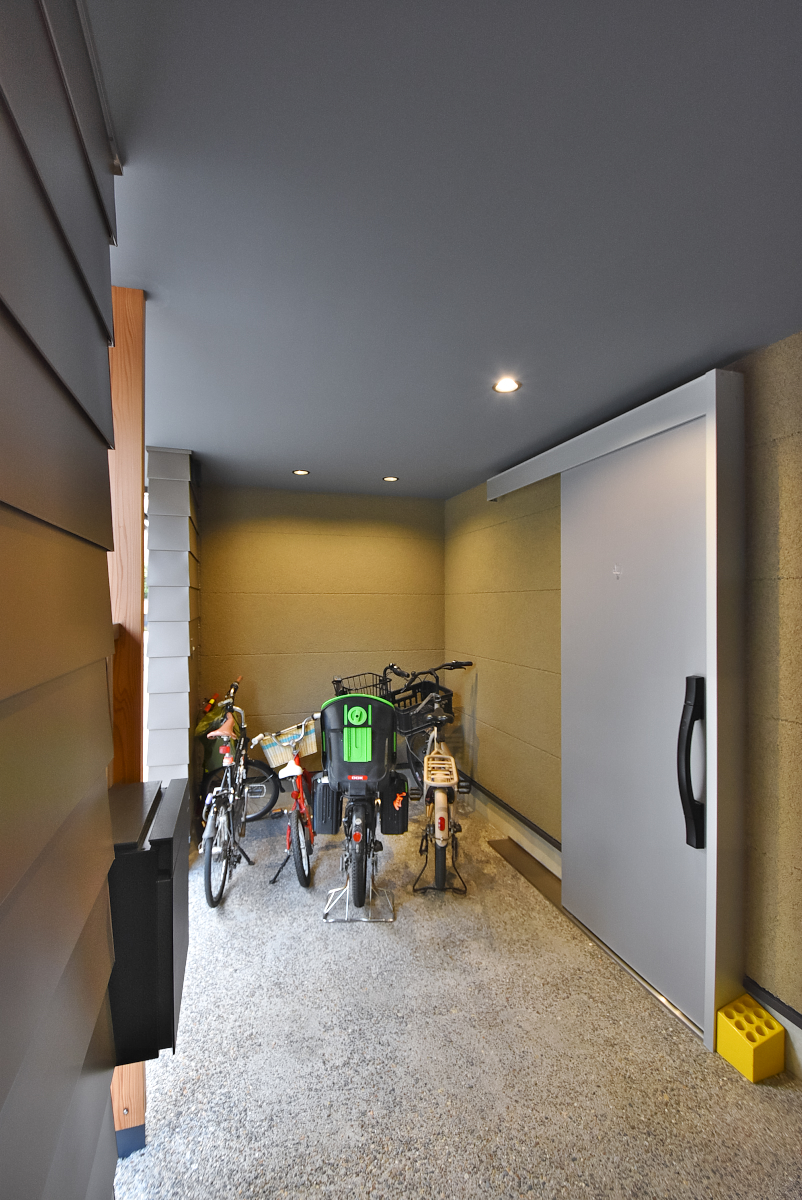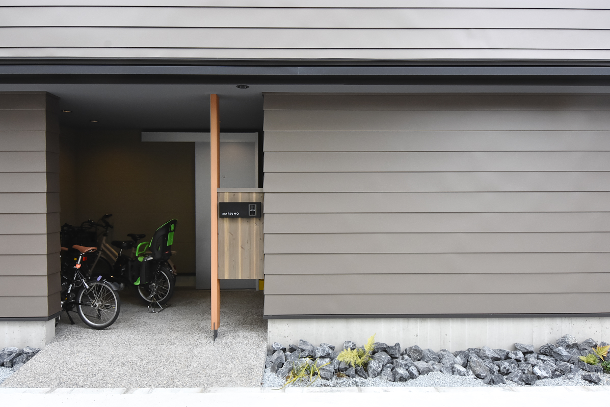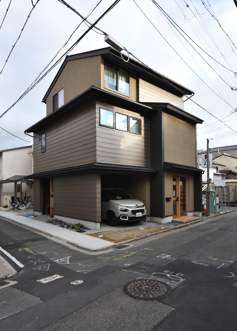京都市は独自の都市計画があり、中でも制約が厳しい地域でした。街並みの景観を統一する為に、全ての道路道に面する外壁の1階2階に60㎝の軒を設ける必要がありました。さらに、通りに圧迫感が出ないように3階は90cmセットバックしなければいけません。屋根は切妻3寸勾配以上、外壁の色は指定範囲以外は禁止です。建物外観デザインをどう組み立てるか、条例を守りながらの大きな壁でした。